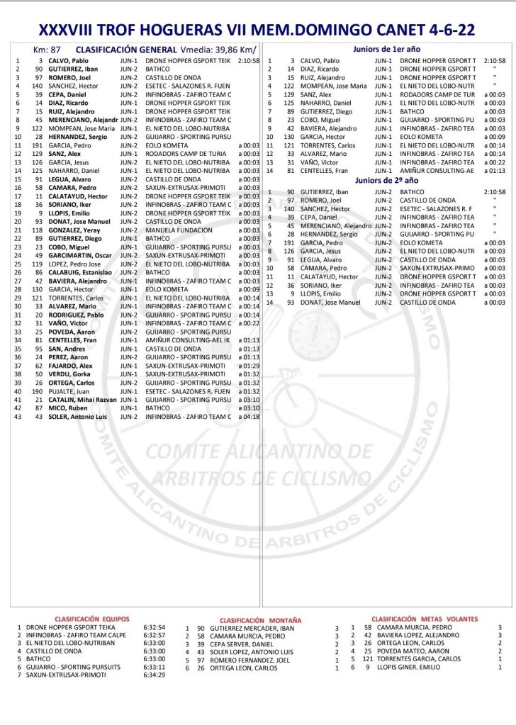 Pablo Calvo (Drone Hopper Gsport) ha sido el ganador del XXXVIII Trofeo Hogueras-VII Memorial Domingo Canet disputado hoy en Jávea para ciclistas júnior. Iban Gutiérrez (Bathco) finaliza segundo y Joel Romero (Castillo de Onda) ha completado el podio. Daniel Cepa (Infinobras) ha firmado un quinto puesto, su compañero de escuadra, Alejandro Merenciano, ha terminado un noveno, mientras que Sergio Hernández (Guijarro) concluye décimo. El Drone Hopper se ha impuesto por escuadras, Iban Gutiérrez se ha llevado la montaña y Pedro Cámara (Saxun), las metas volantes espués de una escapada que murió muy cerca de meta. Joel Romero lidera la Challenge Júnior 2022 por delante de Sergio Hernández y de Iban Gutiérrez.