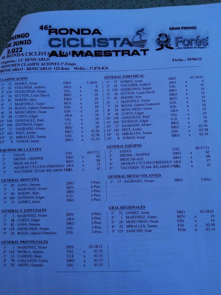 Ya en la subida a la ermita de Vinaroz Josué Gómez y Andrew Vollmer hicieron la selección definitiva y al esprint el alicantino fue más rápido y puso fin a una mala racha en la que incluso una lesión dejó dejó durante semanas fuera de la competición. El tiempo de los dos primeros fue de 3:18:01. A 10 segundos llegó el resto de la fuga con Sergio Geerlings Martínez (Valverde), tercero, y Louis Sutton (Brocar), cuarto. Los Essax Gabriel Rojas y Óscar Moscardó entraron en los puestos séptimo y octavo. Josué Gómez ha vuelto.