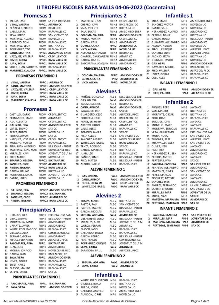 - Benissa. XLIII Prova Provincial d’Escoles de Ciclisme Vila de Benissa – Memorial Alejandro Jaén. Clasificaciones