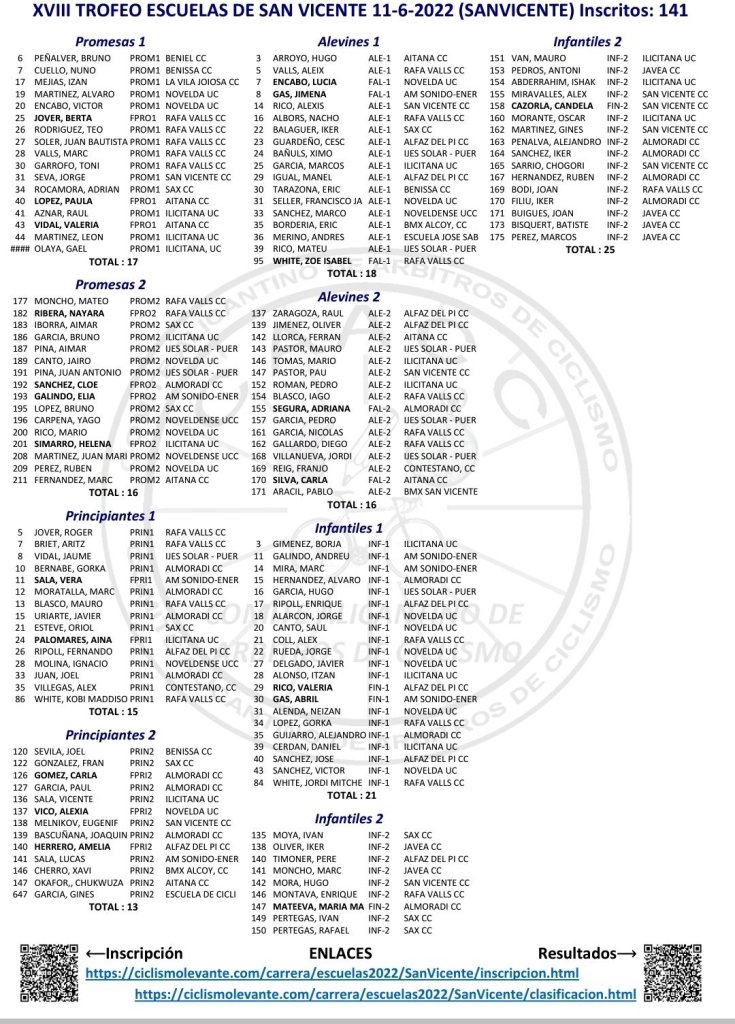 - Benissa. XLIII Prova Provincial d’Escoles de Ciclisme Vila de Benissa – Memorial Alejandro Jaén. Clasificaciones