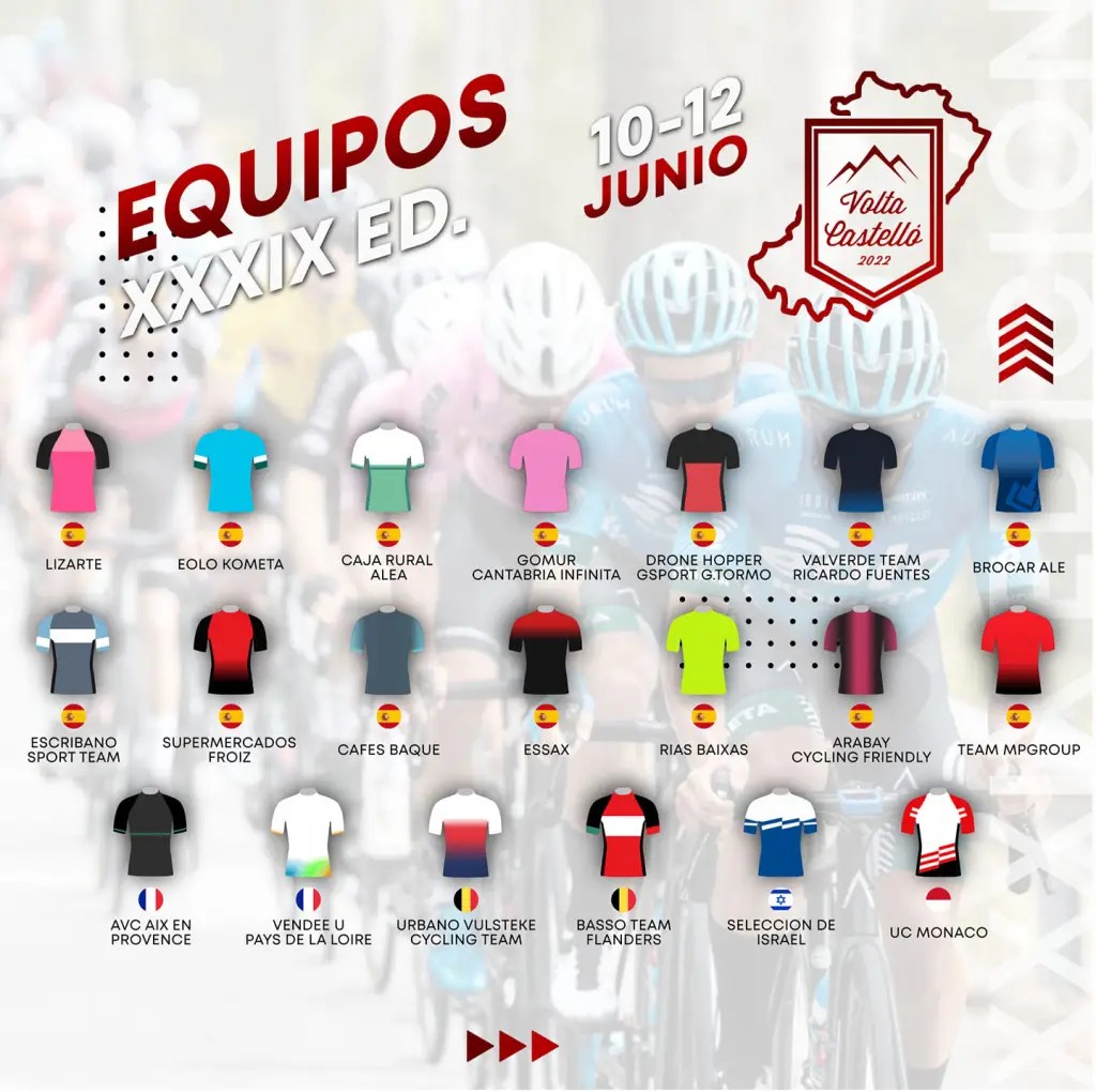 La Volta Castelló 2022 para corredores sub 23 se disputará del 10 a 12 de junio y contará con catorce equipos nacionales y seis extranjeros. En el pelotón estarán las escuadras alicantinas Brocar Alé y Essax. Los alcoyanos participan con Louis Sutton, Álvaro Sagrado, Matt Watson, Marc Dolçs, Josep Tomàs y Camerón Preece. También acuden a la cita castellonense Mario Granero (Drone Hopper), Iván Palomeque (Valverde) y Jaume Guardeño (Filial Caja Rural).