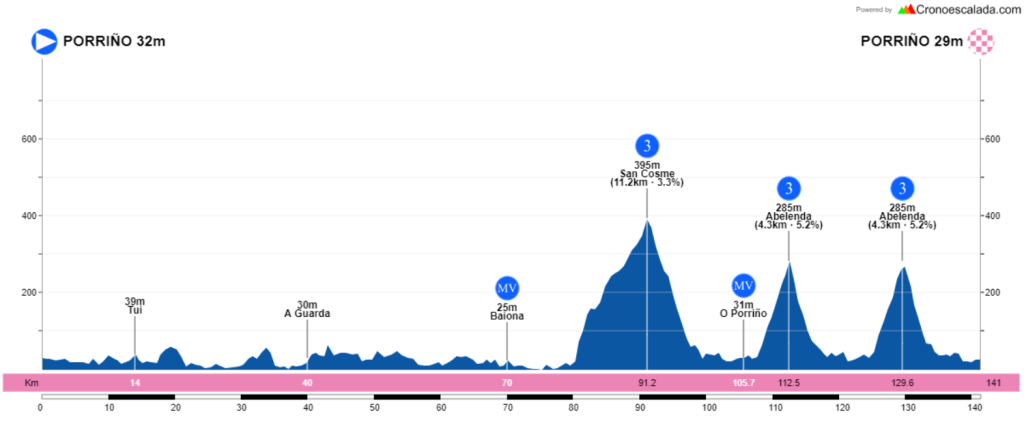 A las 10:30 horas los ciclistas empezarán a darle a los pedales para completar los 137 kilómetros de recorrido con incio y final en O Porriño. Desde la capital de A Louriña se dirigirán a A Guarda y el ecuador de la prueba se alcanzará rodando al lado del mar hasta Baiona. Los puertos de montaña puntuables aparecen en la segunda mitad de la carrera, con las subidas desde Gondomar a San Cosme (3ª categoría) y un doble paso por el Alto de Abelenda, que se corona por segunda vez a 12 km de la línea de meta.