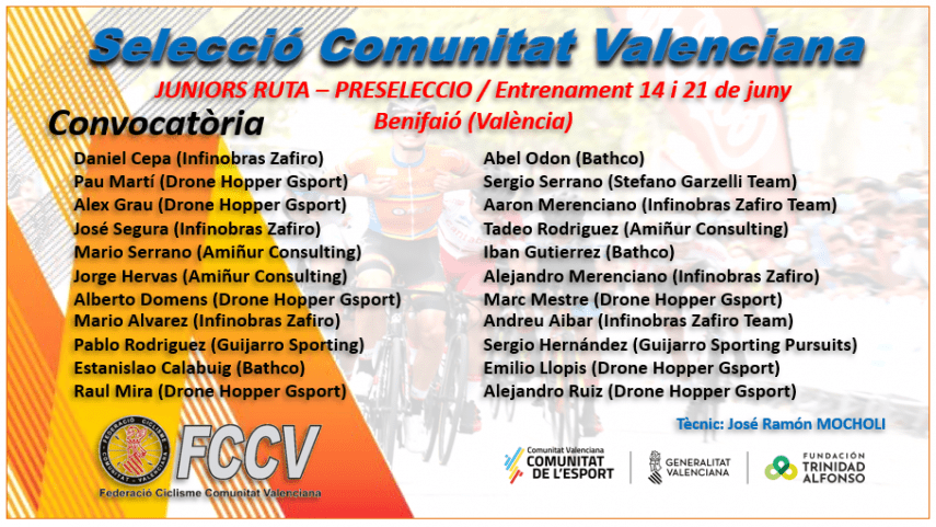 El seleccionador autonómico junior de ruta, José Ramón Mocholí, ha convocado a 22 ciclistas de la categoria para preparar, en Benifaió los días 14 y 21 de junio, el Campeonato de España de ruta que se celebrará en Valladolid a finales de mes. En la preselección aparecen Daniel Cepa, José Segura, Mario Álvarez, Aarón Merenciano, Alejandro Merenciano y Andreu Aibar del Infinobras. Además de Pablo Rodríguez y Sergio Hernández, del Guijarro; y Raúl Mira, del Drone Hopper.