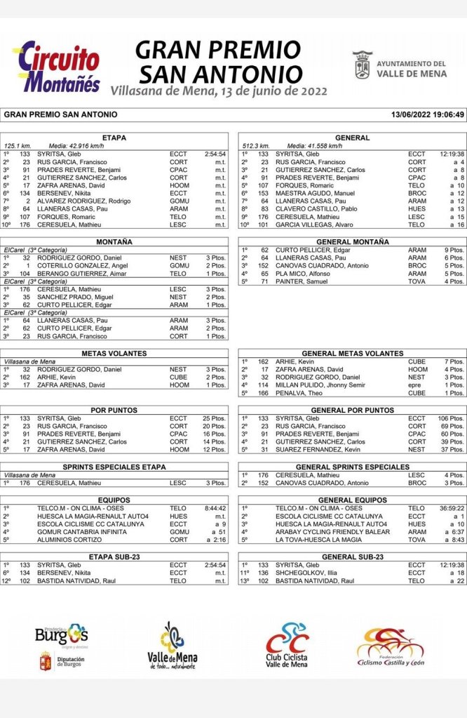 Gleb Syritsa (CC Catalunya) hoy no ha dado espacio a la sorpresa y se ha impuesto en el Gran Premio San Antonio de Villasana de Mena, última jornada del Circuito Montañés en el que se ha impuesto el corredor ruso. Su tiempo ha sido de dos horas, 54 minutos y 54 segundos. Francisco Rus García (Cortizo) ha sido segundo y Benjamí Prades (ControlPack) , tercero. En la general Syritsa ha superado en cuatro segundos a Rus García, y, en 8, a Carlos Gutiérrez, ambos del Cortizo, que le han acompañado en el podio final.