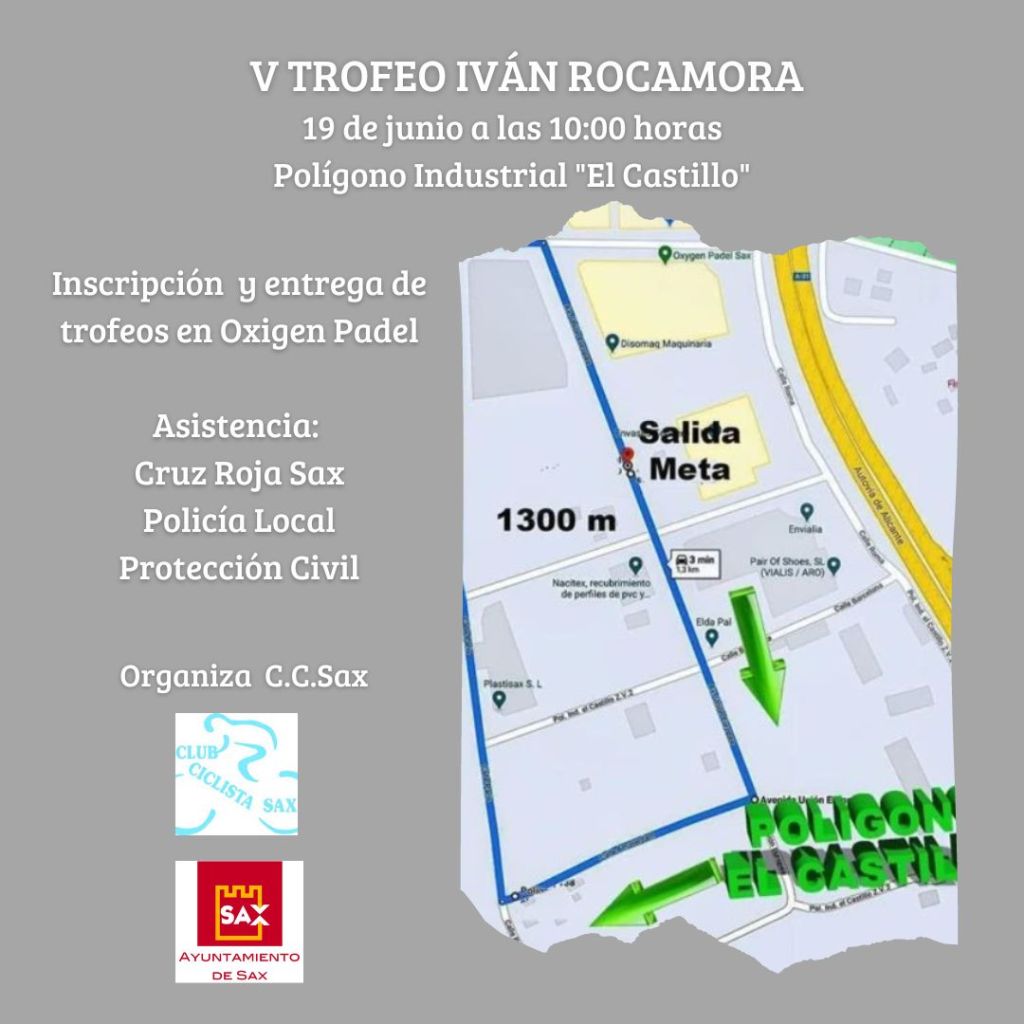 El domingo, día 19 de junio, se disputa el V Trofeo Iván Rocamora de Escuelas en Sax. La competición se desarrollará, a partir de las 10 horas, en el Polígono Industrial «El Castillo». Una vez más el Club Ciclista Sax, organizador del evento, recuerda a Iván Rocamora. Las inscripciones y entrega de trofeos se realizaran en Oxigen Padel.