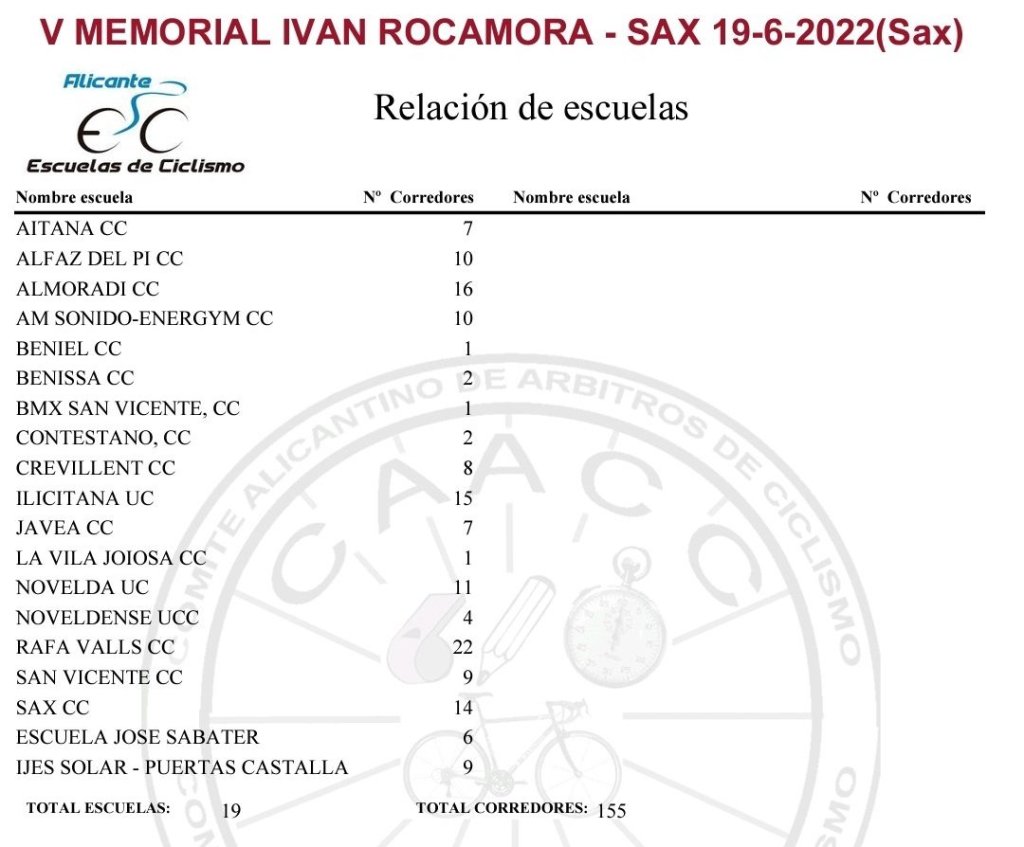 - Benissa. XLIII Prova Provincial d’Escoles de Ciclisme Vila de Benissa – Memorial Alejandro Jaén. Clasificaciones