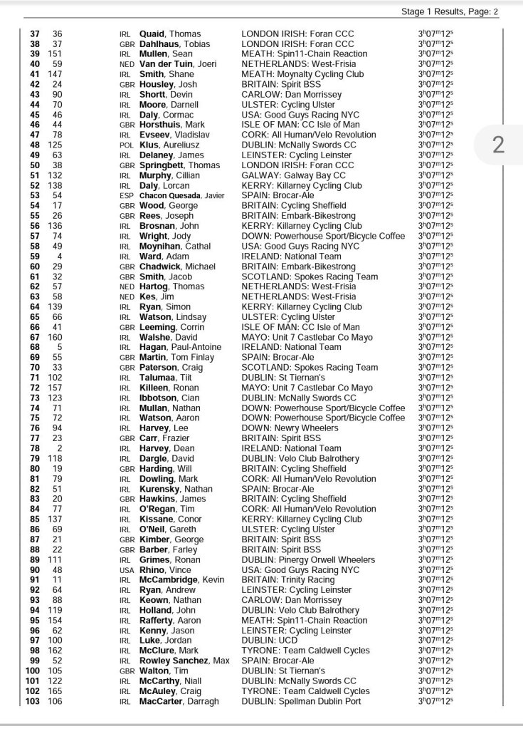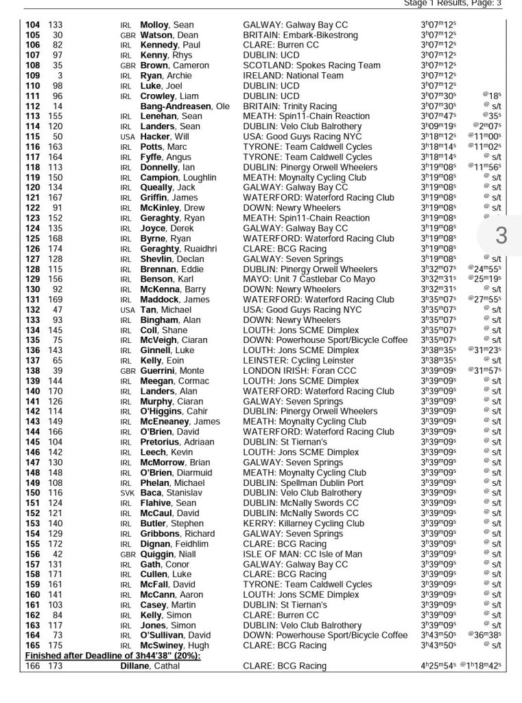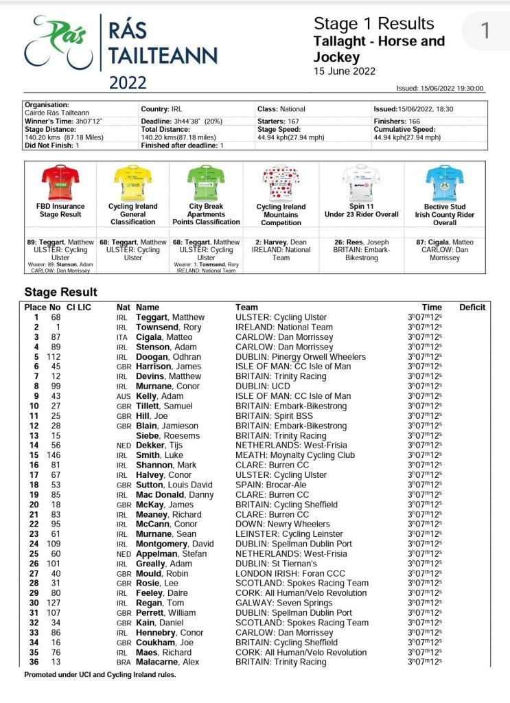 Matthew Teggart (Cycling Ulster) ha sido el ganador al esprint de la primera etapa de la Rás Tailteann, prueba que se disputa en Irlanda desde hoy y hasta el domingo, y que ha llevado al pelotón de Tallaght Stadium a Horse and Jockey (140,1 km). La segunda plaza ha sido para Rory Townsend (Irlanda) y Matteo Cigala-Carlow (Dan Morrisey) ha completado el podio. Al final los equipos con esprinters abortaron las mil y una escaramuzas que se protagonizaron durante la jornada. En una de ellas estuvo el corredor del Brocar Alé Nathan Kurensky, pero atrapado a quince kilómetros de meta.