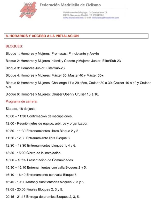 La Federación Madrileña de Ciclismo, el Ayuntamiento de Madrid y la Comunidad de Madrid serán los impulsores de este nacional que destinará la jornada del viernes 17 de junio para la celebración de los primeros entrenamientos oficiales. El sábado 18, los distintos bloques de participantes tendrán la oportunidad de entrenar entre las 10:30 y las 13:30 horas en el circuito y será a las 16:45 horas cuando se produzca el inicio de la competición con las Motos y mangas clasificatorias de los bloques 2, 4 y 5. Las finales de estos mismos bloques se celebrará a partir de las 19:05 h. El domingo, a las 9:45 horas empezarán a competir en las motos y clasificatorias los bloques 1, 3 y 6 y disputarán sus respectivas finales desde las 12:10 horas.