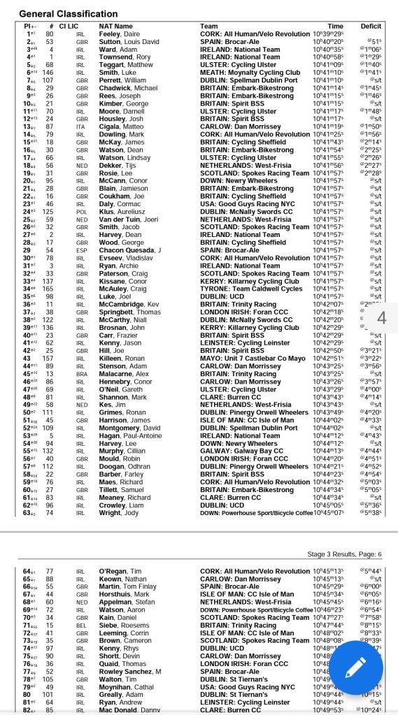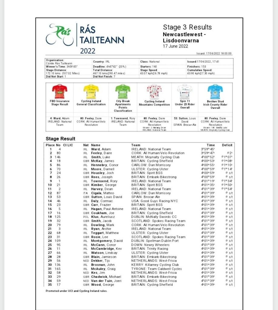Adam Ward (Irlanda) ha sido el vencedor de etapa tercera de la Rás Tailteann que ha llevado el pelotón de Castleisland a Lisdoonvarna (173,8 km). Se ha impuesto a su compañero de fuga Daire Feeley (Velo Revolution). Luke Smith (MoynaltyCC) ha ocupado la plaza número tres. Daire Feeley arrebata el maillot amarillo a Louis Sutton (Brocar Alé), ganador de la etapa dos. Había comenzado la jornada en octavo lugar en la general, aproximadamente 1:01 menos que el líder de la carrera, Sutton.