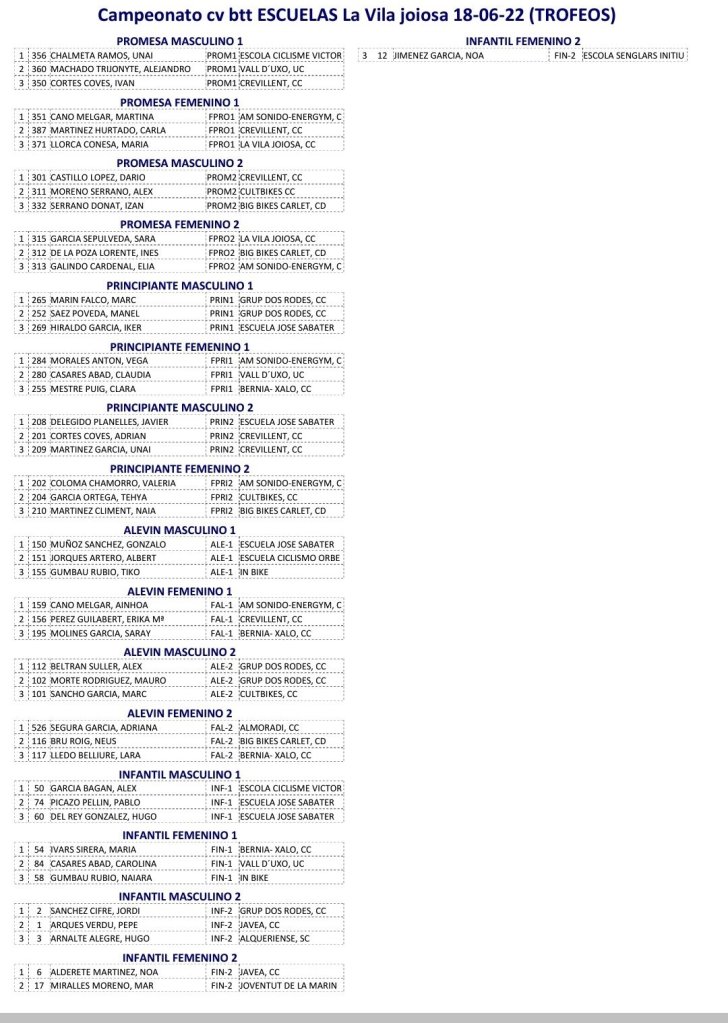 Hoy se ha disputado el Campeonato de la Comunitat Valenciana de BTT XCO para Escuelas en un circuito diseñado en la Platja del Torres de La Vila. Han logrado el preciado maillot: Unai Chalmeta (Víctor Cabedo) y Martina Cano (AM Sonido), en Promesas 1; Darío Castillo (Crevillent) y Sara García (La Vila), en Promesas 2; Marc Marín (Grup Dos Rodes) y Vega Morales (AM Sonido), en Principiantes 1; Valeria Coloma (AM Sonido) y Ainhoa Cano (AM Sonido), en Alevines 1; Álex Beltrán (Grup Dos Rodes) y Ariadna Segura (Almoradí), en Alevines 2; Álex García (Víctor Cabedo) y María Ivars (Bernia Xaló), en Infantiles 1; y Jordi Sánchez (Grup Dos Rodes) y Noa Alderete (Jávea), en Infantiles 2.