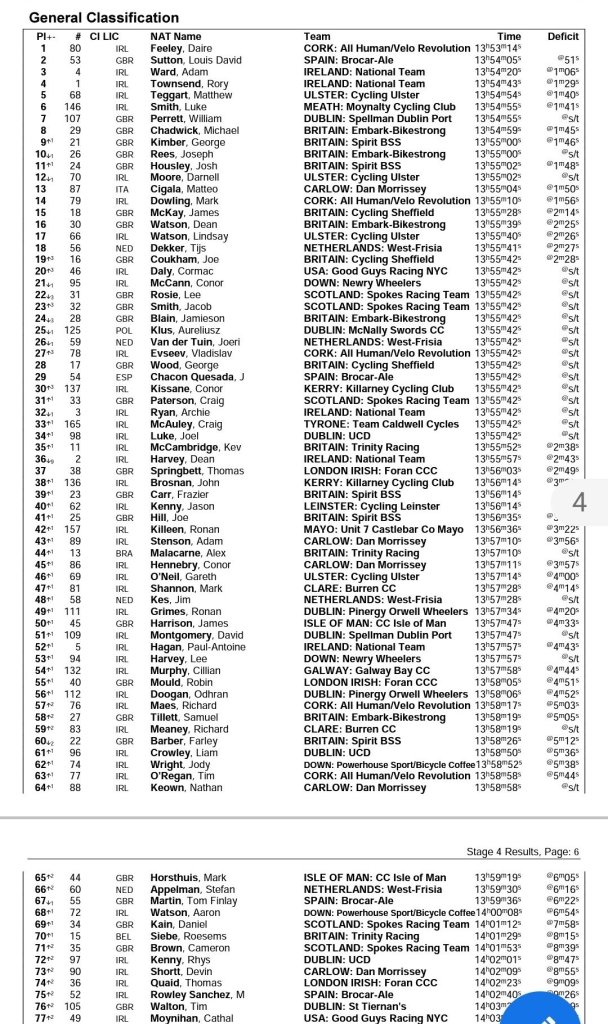 Rory Townsend (Irlanda) ha ganado al esprint la cuarta etapa de la Rás Tailteann. Odhran Doogan (Orwell Wheelers) ha entrado en segundo lugar Matteo Cigala-Carlow (Dan Morrisey), tercero. Daire Feeley sigue de líder con un margen de casi un minuto (51 segundos) sobre Louis Sutton (Brocar Alé) a falta de la última etapa.