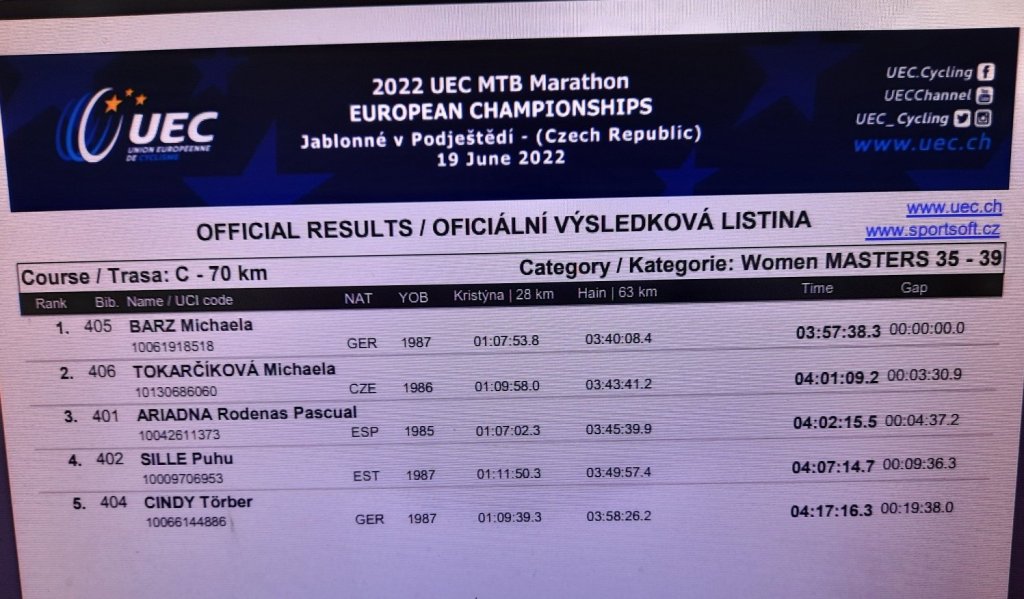 La bikers ilicitana Ariadna Ródenas (Kenza Sport) ha logrado la medalla de bronce en la categoría máster 35-39 en el Europeo XC de Maratón que se está disputando en República Checa. Michaela Barz ha sido la primera con un tiempo de 3-57-38.3. A 3.30,9 ha entrado en meta Michaela Torcaciková, mientras que Ródenas ha perdido 4.37,2 con relación a la vencedora en los 70 kilómetros recorridos, con 1.700 metros de desnivel y un calor sofocante. «He ido en cabeza hasta casi el kilómetro 40, pero cuando hemos llegado a las horas centrales del mediodía me ha pasado factura… creo que salir a las 10:45 no ha ayudado mucho», ha recordado en su cuena en Facebook.
