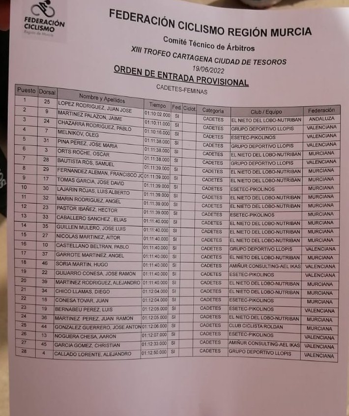 Juan José López (El Nieto) se ha adjudicado el XIII Trofeo Cartagena «Ciudad de Tesoros» para corredores cadetes. Su tiempo ha sido de una hora, 10 minutos y diez segundos. Jaime Martínez (GD Llopis) ha entrado a contuación y Pablo Chazarra (Esetec Pikolinos) ha completado el podio. Oleg Melnikov (GD Llopis), cuarto, ha dado tiempo al pelotón. Sexta plaza para Óscar Orts (GD Llopis) y novena para José David Tomás (Esetec Pikolinos).