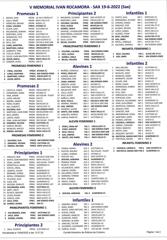 - Benissa. XLIII Prova Provincial d’Escoles de Ciclisme Vila de Benissa – Memorial Alejandro Jaén. Clasificaciones