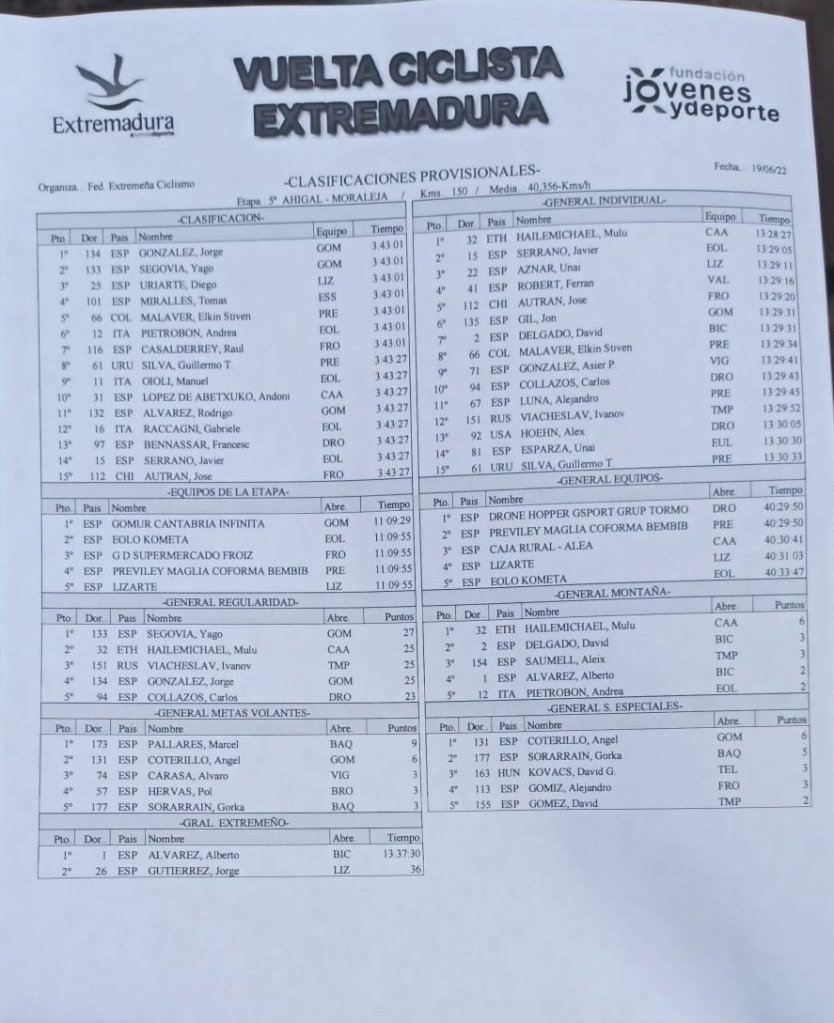 En la clasificación general no había cambios con esta etapa reina y el etíope Mulu Kinfe Hailemichael conseguía el amarillo con Javier Serrano (Eolo-Kometa) y Unai Aznar (Lizarte) a su lado.