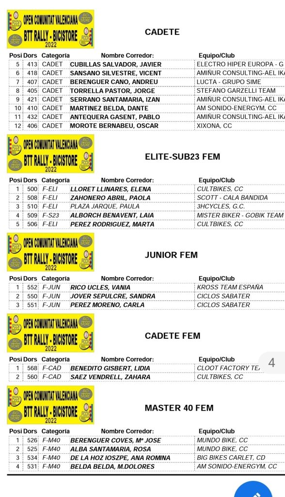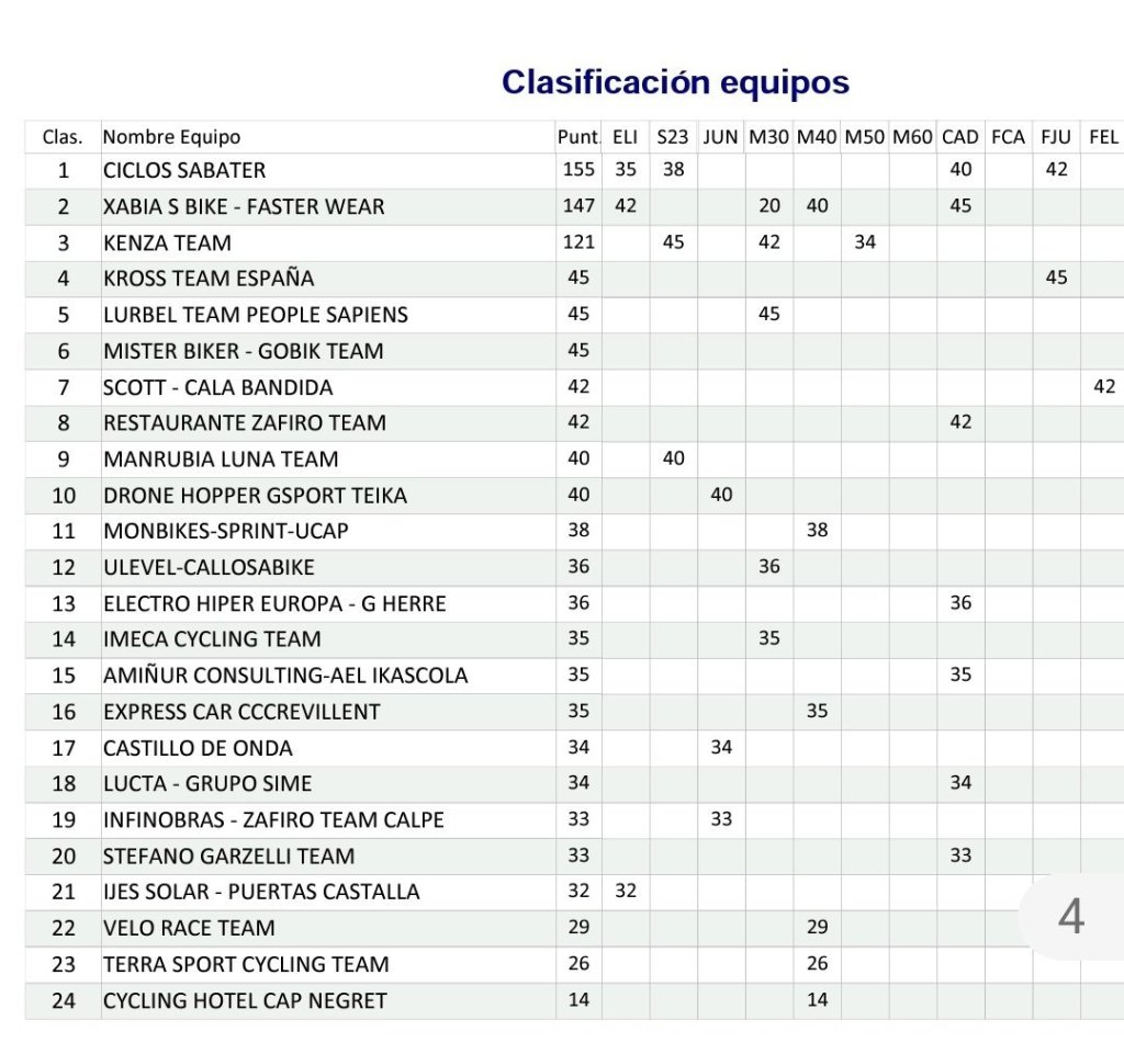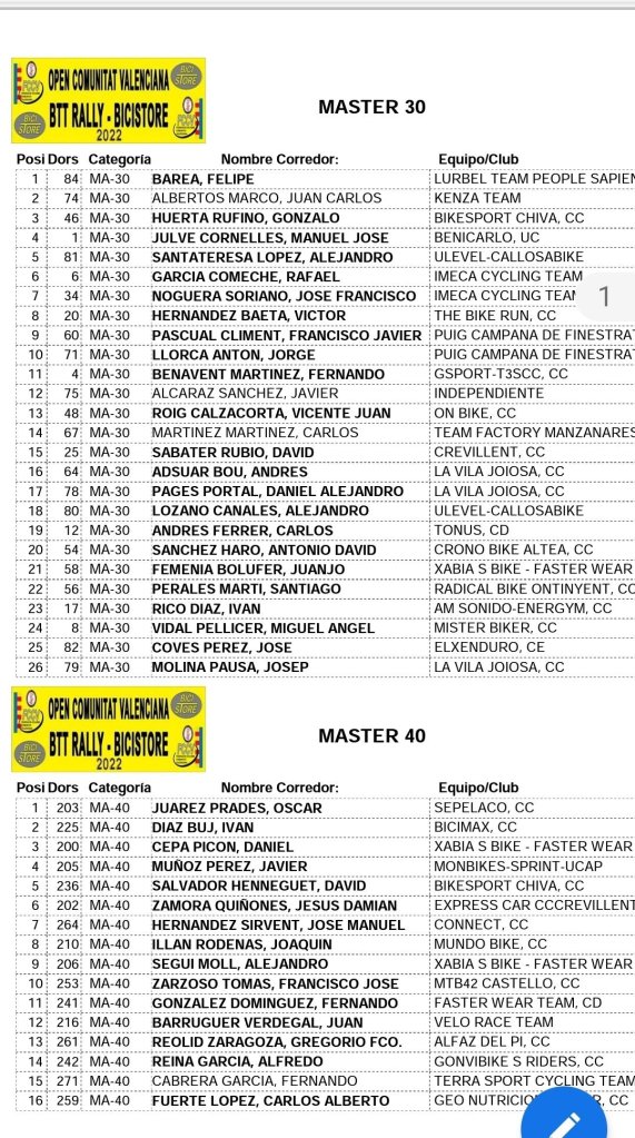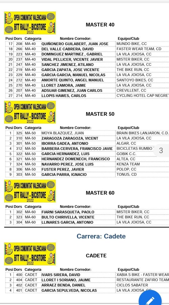 El resto de ganadores han sido: Felipe Barea (Lurbel), en M30; Óscar Pérez (Sepelaco) y María José Berenguer (Mundobike), en M40; Vicent Zaragoza Zaragoza (La Vila), en M50; y Paolo Fiarni (Mister Biker), en M60.