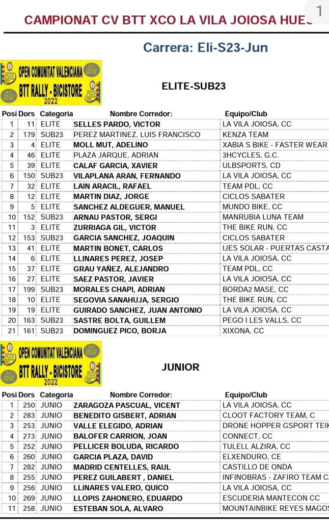 Víctor Sellés (Cyclic) y Elena Lloret (Kenza Sport) se han proclamado hoy en La Vila campeones Autonómicos de BTT en la categoría élite. Fernando Vilaplana (Cyclic) y Laia Alborch (Mister Biker) lo han hecho en Sub 23; Vicent Zaragoza (Cyclic) y Vania Rico (Kross), en Juniors; y David Ivars (Xabia’s Bike) y Lidia Benedito (Cloot) en cadetes.