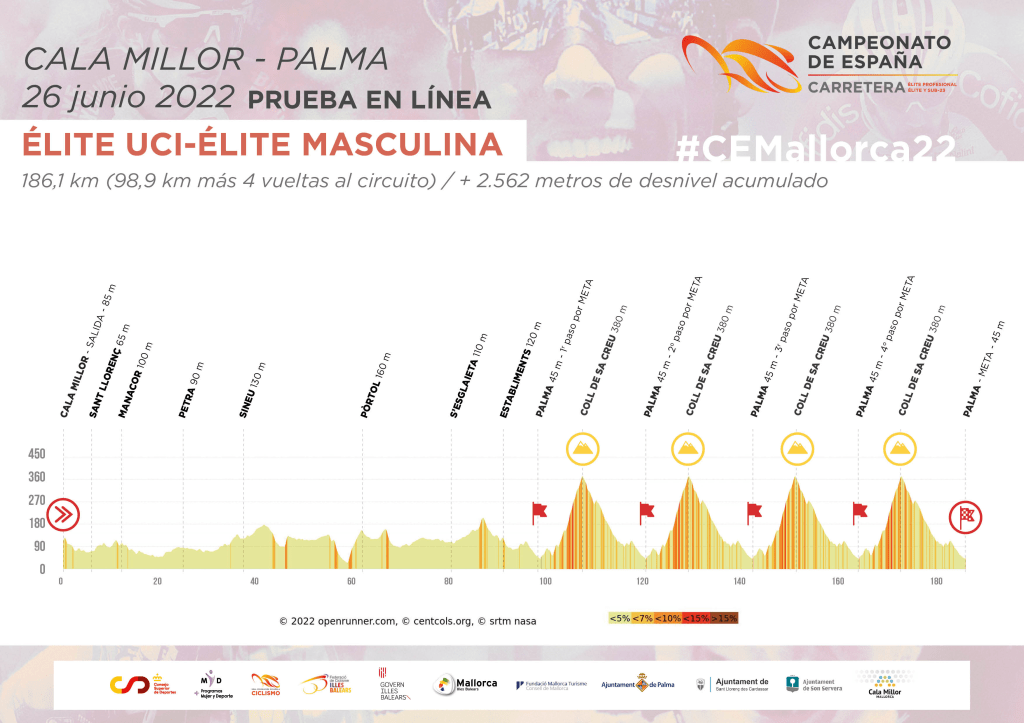 El Campeonato de España de carretera Élite-Sub23 llegará a su conclusión con la celebración el domingo de la prueba en línea Élite UCI-Élite masculina, que al igual que los sub23 tomarán la salida desde Cala Millor para encarar el tramo de 98 km que los conducirá hasta Palma. El pelotón Élite UCI-Élite dará cuatro vueltas al circuito de Palma y, por tanto, afrontarán en cuatro ocasiones la subida al Coll de Sa Creu, que ofrecerá un abierto y espectacular desenlace a todos los aficionados a nuestro deporte.