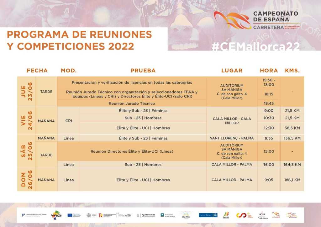 El sábado 25 de junio se celebrarán las primeras pruebas en línea, de las que serán protagonistas las féminas Élite-Sub23 y los chicos sub23. El pelotón amateur masculino realizará, a partir de las 16 horas, un primer tramo inicial de 98 kilómetros, puesto que la salida se efectuará desde Cala Millor, para llegar al mismo circuito de Palma, sobre el que realizarán tres giros con sus respectivos pasos por el Coll de Sa Creu, que será el juez que decida el nuevo campeón de España de la categoría. En total serán 164,3 kilómetros de recorrido.