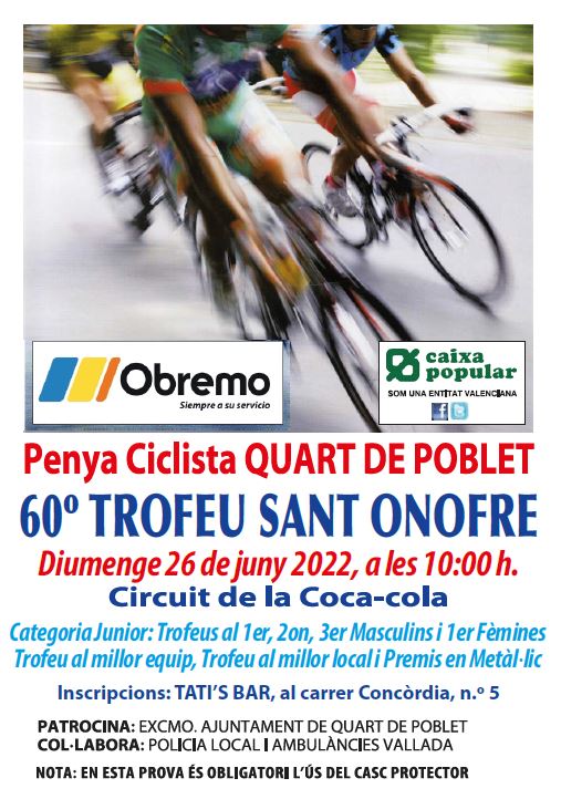 El domingo se disputa en Quart de Poblet la 60 edición del Trofeu Sant Onofre para corredores júniors. La carrera dará comienzo a las 10 horas, en el denominado Circuit de la Coca Cola, y tomarán la salida todos los equipos alicantinos de la categoría, es decir, Infinobras, Saxun Extrusax Primoti y Guijarro. Lista de inscritos.