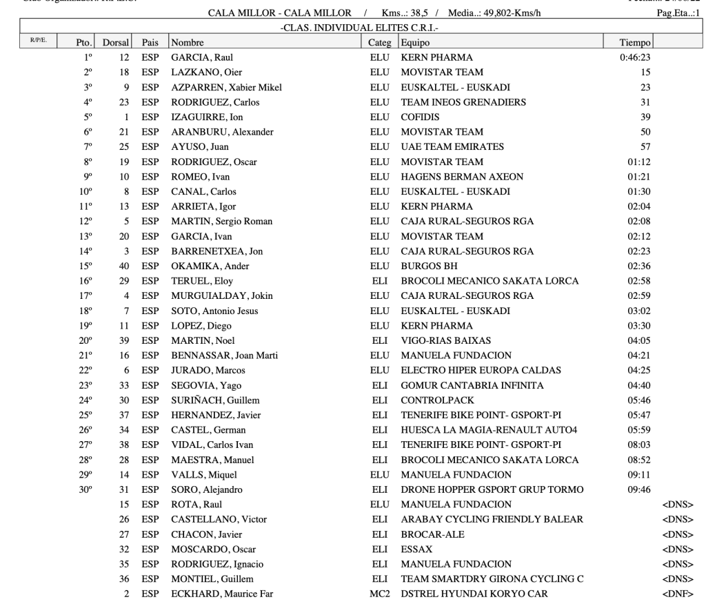 Raúl García Pierna se ha adjudicado la medalla de oro en el Campeonato de España contrarreloj elite UCI que ha disputado hoy en Cala Millor. El madrileño del Kern Pharma fue más rápido que el Movistar, Oier Lazkano, y el Euskaltel, Xabier Azparren, que han completado el podio. Juan Ayuso ha sido séptimo.