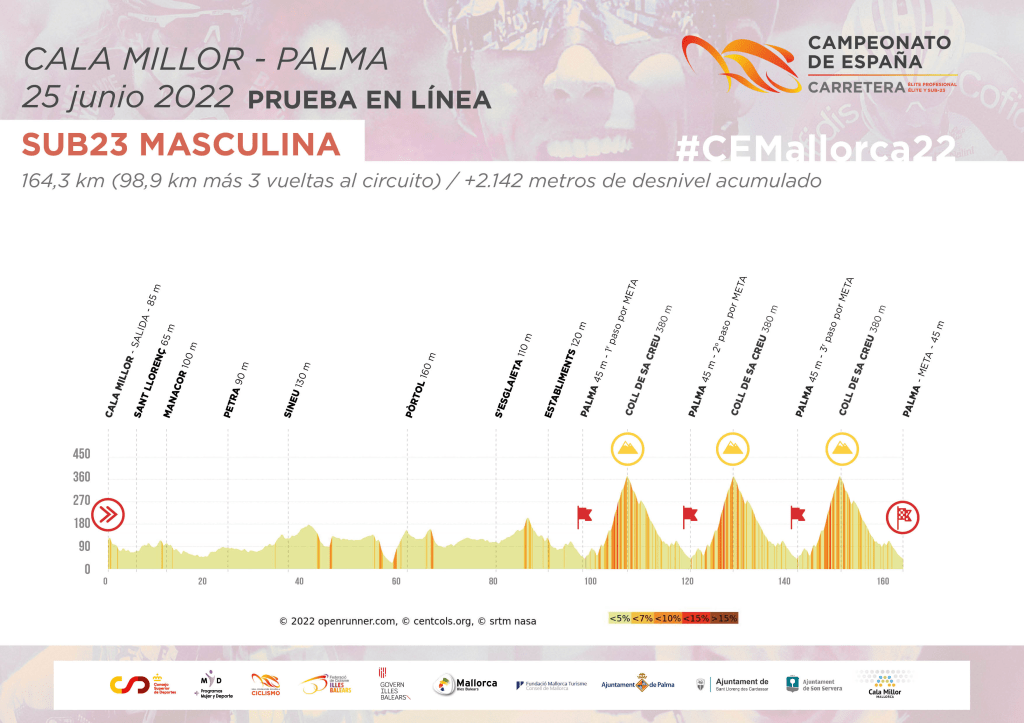 Hoy, sábado 25 de junio, se celebran las primeras pruebas en línea, de las que serán protagonistas las féminas Élite-Sub23 y los chicos sub23. El pelotón amateur masculino realizará, a partir de las 16 horas, un primer tramo inicial de 98 kilómetros, puesto que la salida se efectuará desde Cala Millor, para llegar al mismo circuito de Palma, sobre el que realizarán tres giros con sus respectivos pasos por el Coll de Sa Creu, que será el juez que decida el nuevo campeón de España de la categoría. En total serán 164,3 kilómetros de recorrido. «El recorrido es peligroso y ratonero. Si la colocación es importante en los Campeonatos de España, en este caso, lo será todavía más», reconoce Josep Tomàs tras pedalear por el trazado del Nacional. De esa idea es Jaume Guardeño: «El puerto es bastante estrecho y la bajada sinuosa. Hay que estar atento en todo momento».