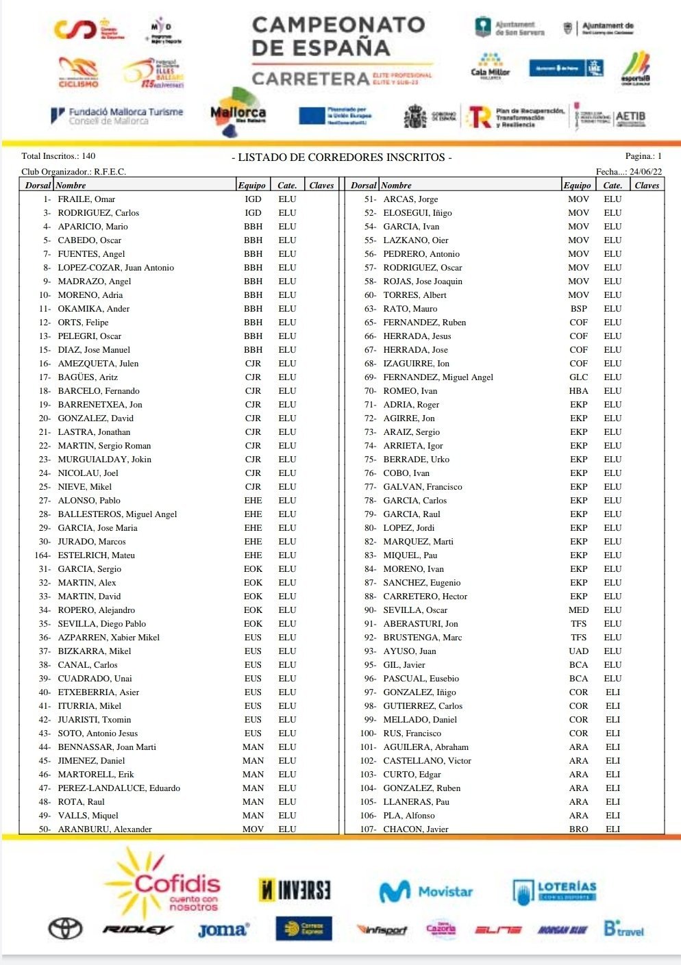 La prueba en línea Élite UCI-Élite masculina promete brindar un bonito y esperado encuentro entre dos de los jóvenes que más ilusionan al aficionado al ciclismo, Juan Ayuso y Carlos Rodríguez, con algunos de los corredores que mejor han competido y más han honrado el Campeonato de España en el último lustro, como los ex campeones Jesús Herrada, Omar Fraile o Ion Izagirre. Un apetecible menú para la prueba final de esta edición 2022 del nacional, que se desarrollará en la Isla de Mallorca y que conocerá el domingo 26 de junio al ciclista que portará el maillot de campeón de España durante los próximos 365 días.