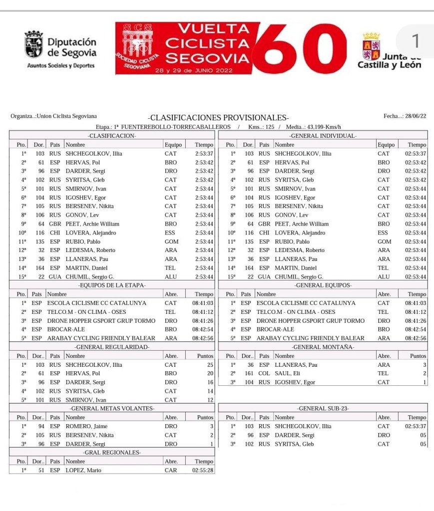 Ilia Rus Shchegolkov (Catalunya) ha sido el ganador de la primera etapa de la 60 Vuelta a Segovia que ha unido Fuenterrebollo y Torrecaballeros tras 125,10 kilómetros de recorrido. Su tiempo ha sido de 2:53:37 y se ha vestido de líder. El corredor del Brocar Alé, Pol Hervás ha entrado a continuación, a cinco segundos. Sergi Darder ha completado el podio de la jornada. A partir de ahí, cinco compañeros del ganador de la jornada en la clasificación.