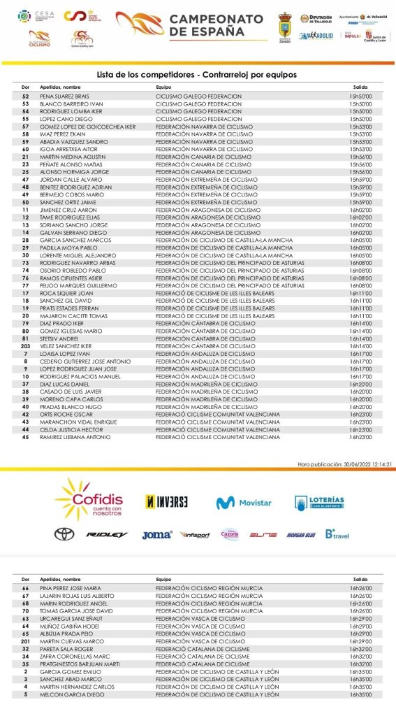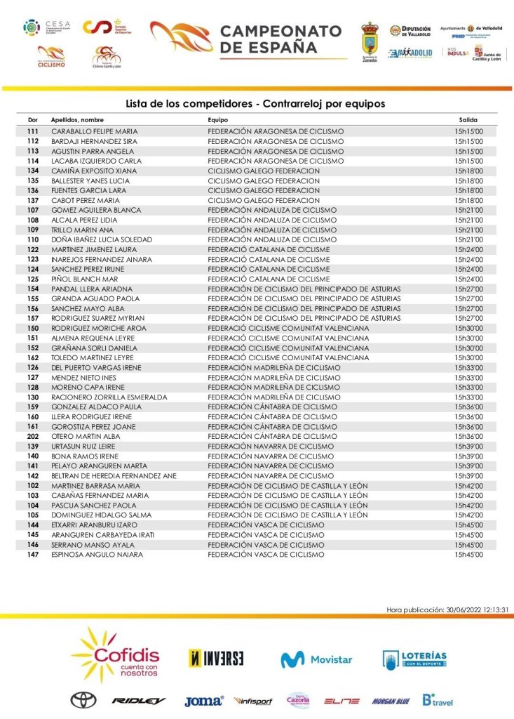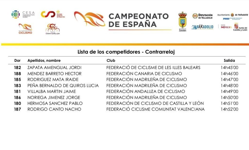 Después lo harán los cadetes por equipos, donde los partícipes se enfrentarán a un recorrido de 9,8 kilómetros. Una hora más tarde, tendrán salida los inscritos de la misma categoría en las cronos individuales. En la categoría masculina, Héctor Álvarez hará la contrarreloj individual, mientras que Óscar Orts, Enrique Maranchón, Héctor Celda y Toni Ramírez competirán en la de por conjuntos. En féminas, Leyre Toledo, Leyre Almela, Daniela Grañana y Aroa Rodriguez harán la contrarreloj por escuadras. Vera Valero (Hyundai Koryo) estará en la CRI.