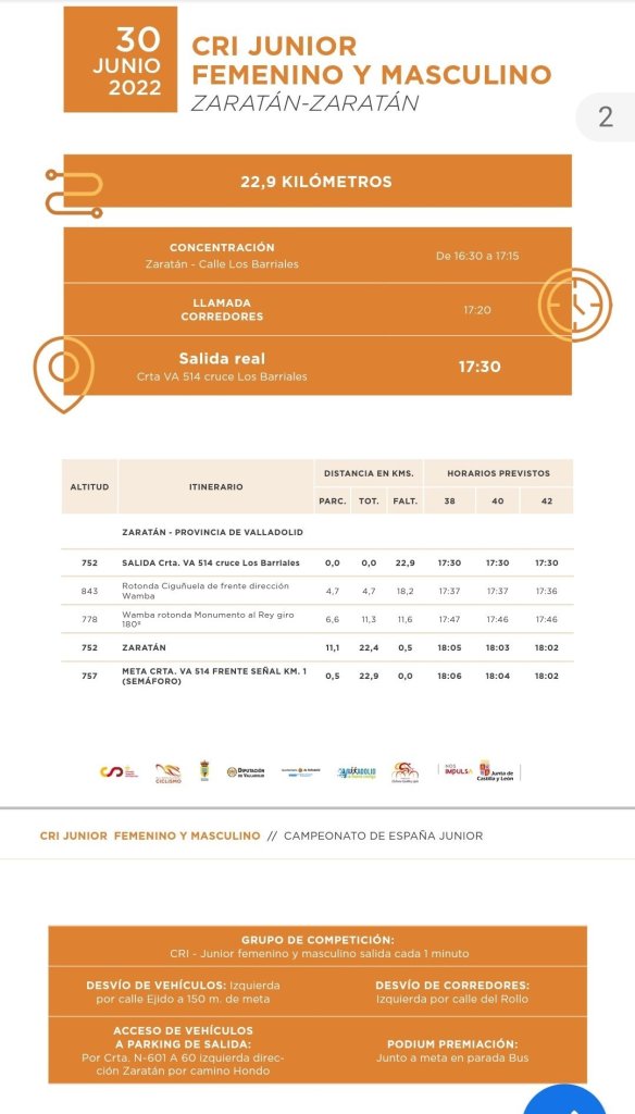 Hoy jueves, 30 de junio, arranca en Valladolid el Campeonato de España de Carretera Junior 2022, donde se darán cita los mejores corredores del panorama nacional con edad comprendida entre los 17 y 18 años. Comenzará la competición a las 17:30 horas con la prueba de CRI, donde los partícipes se enfrentarán a un recorrido de 22,9 kilómetros sobre el entorno de Zaratán con salida en el cruce de Los Barriales, en la lucha por el título nacional junior de contrarreloj en categoría masculina y femenina.