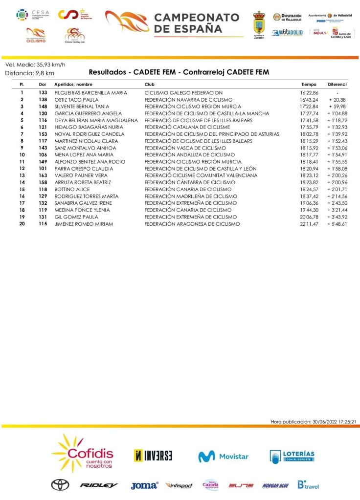 En féminas, la gallega María Filgueiras ha sido la mejor, por delante de Paula Ostiz (Federación Navarra) y de Tania Silvente (Federación de Murcia). Puesto 13 para Vera Valero, de la Comunitat Valenciana.