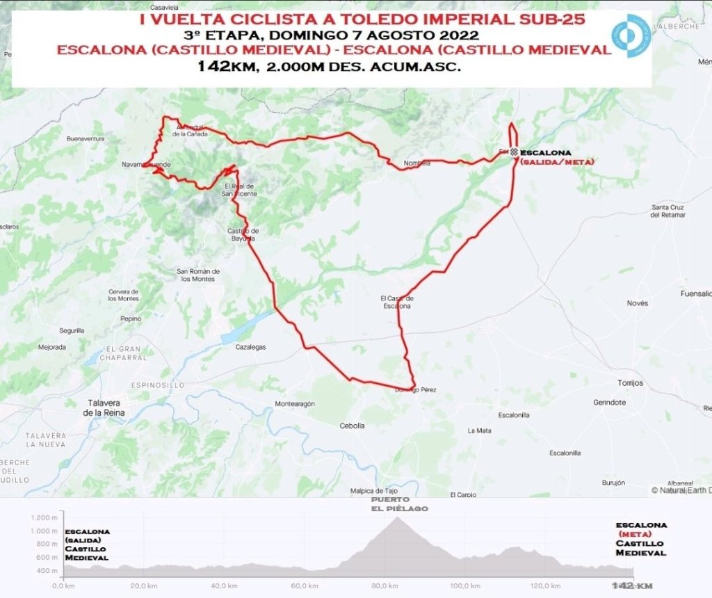 El domingo 7 de agosta la carrera se decidirá en un recorrido circular con salida y llegada a Escalona. 142 kilómetros y 1.800 metros de desnivel que ‘esconden’ un tramo de sterrato de un kilómetro a su paso por el municipio de Otero, la subida al Puerto del Piélago (que también se ascenderá en La Vuelta a España 2022) y otro final para ‘puncheurs’ en el Castillo de Escalona, con 600 metros al 6%. Sobre las 15.00h ya se conocerá al primer ganador de la Vuelta a Toledo Imperial sub-25.
