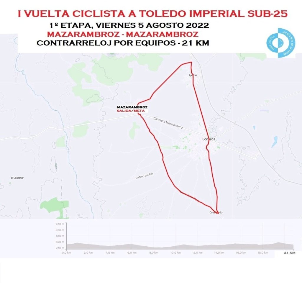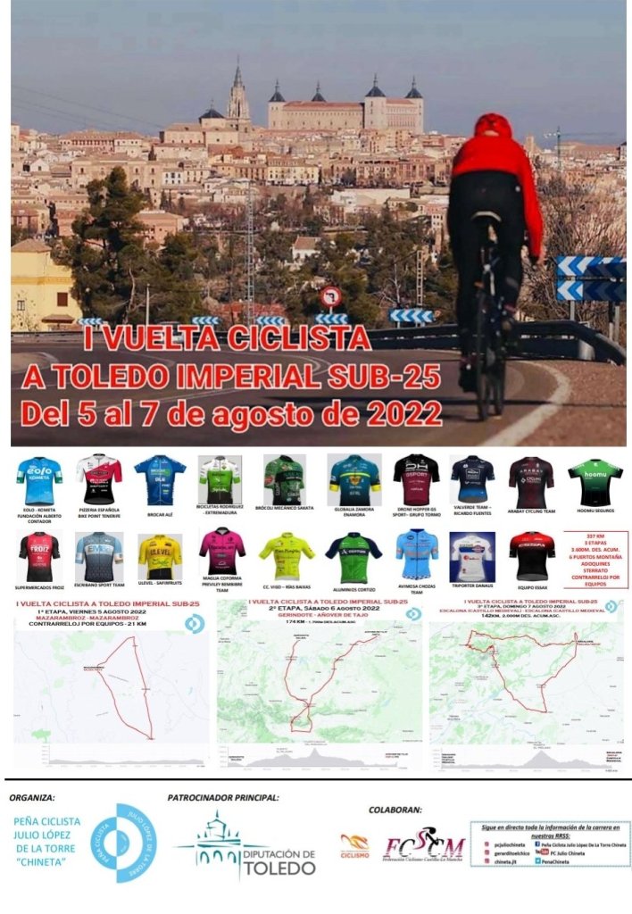 Ya se conoce el trazado de las tres etapas de la primera edición de la Vuelta a Toledo Imperial. La carrera, que tendrá equipos de toda España, empezará el viernes 5 de agosto a las 19:00h en Mazarambroz con una crono por equipos. Serán 21 kilómetros prácticamente llanos (solo 100 metros de desnivel), pero con un tramo de adoquines de 300 metros en Casalgordo y seis curvas de 90º que pondrán a prueba la coordinación de los 19 equipos invitados y otorgarán el primer maillot de líder. A las 19:30 finalizará el primer equipo y el último sobre las 20:30 horas. En la salida estarán las escuadras alicantinas Brocar Alé y Essax.