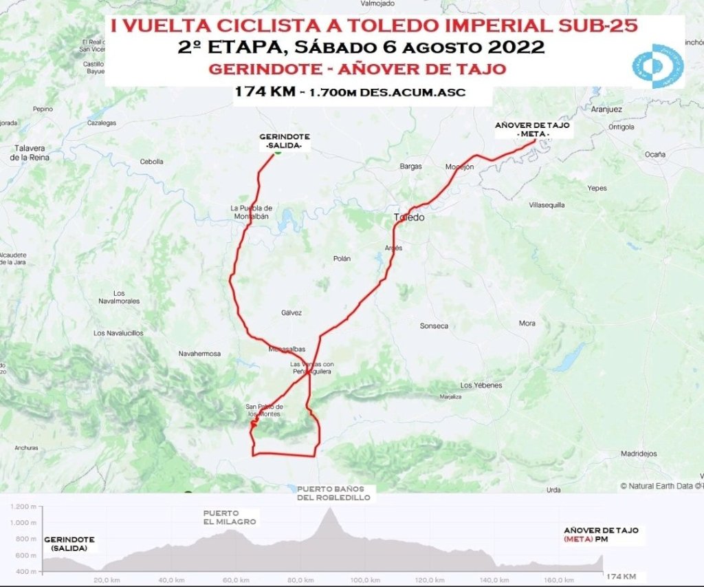 El sábado 6 de agosto de disputará la etapa reina de esta primera edición. 174 kilómetros entre Gerindote y Añover de Tajo con 1.700 metros de desnivel. Por el camino dos puertos de montaña, el Alto del Milagro y las curvas del Alpe d’Huez de Cabañeros, el Alto de los Baños del Robledillo, con cuatro kilómetros al 7% de desnivel medio. Desde su cima quedarán 86 kilómetros, pasando por Toledo, hasta Añover de Tajo. Pero ojo, que no acaba en llano, sino en una subida de dos kilómetros al 5,3%. Final ‘picante’ al que llegarán los ciclistas entre las 14:30 y las 15:00 horas.