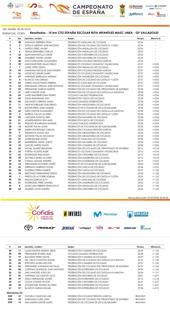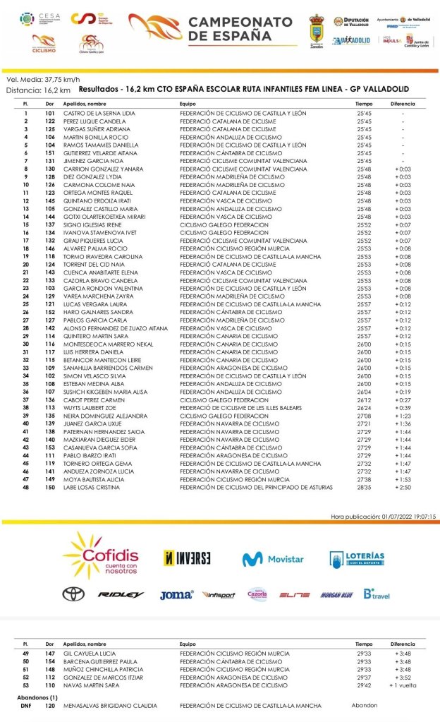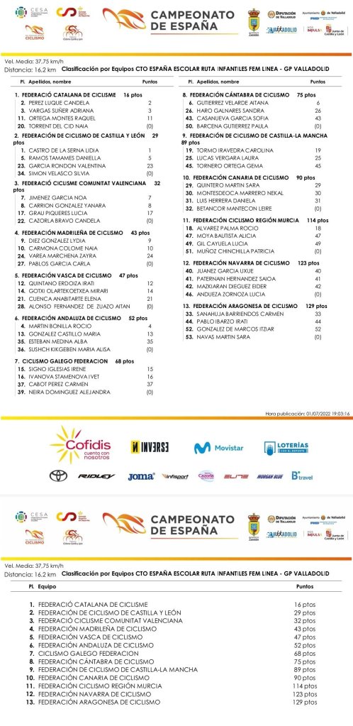 La vallisoletana Lidia Castro y el catalán Fran Alemany se han proclamado campeones de España de ruta en la categoría Infantil. Castro ha estado acompañada en el podio por Candela Pérez y Adriana Vargas. Ambas de la Federación Catalana, que se ha impuesto por equipos, con la selección de Castilla y León, segunda, y la FCCV, tercera. Noa Jiménez ha finalizado séptima; Yanara Carrión, octava; Lucía Grau, en el puesto 17; y Candela Carzola, en la 22.