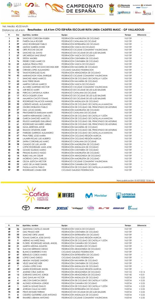 Rubén Sánchez se ha proclamado hoy al esprint campeón de España cadete de ruta en Valladolid tras imponerse en un trazado de 65,4 kilómetros. La selección de la FCCV ha estado muy activa y corredores como Héctor Celda y Antonio Ramírez han estado escapados en diversos momentos de la jornada. A 18 kilómetros de meta, en la población de Wamba, se ha producido el reagrupamiento. A diez de la conclusión, afrontando Zaratán, se iban Héctor Álvarez, Adriá Pericas y Marco Martín, pero el pelotón no permite que abran hueco y los incorpora a su disciplina. El vasco Marco Martín no entraba a los relevos. Al final, todo se decidió al esprint y el madrileño Rubén Sánchez fue el más rápido. Roger Pareta logró la plata para Cataluña y Pablo Leno, el bronce para Extremadura. Óscar Orts ha sido quinto y el combinado de la FCCV segundo por escuadras.