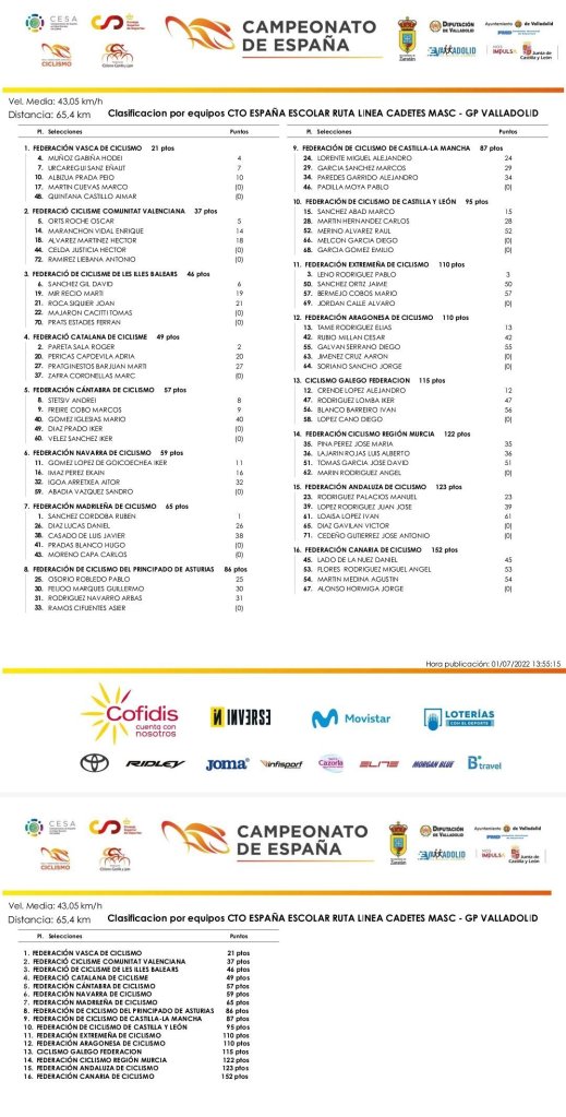 Las espadas estaban por todo lo alto y no había un favorito claro para llevarse la victoria. Los ataques se produjeron nada más arrancar la prueba. Iván Loaisa (Andalucía) y Antonio Ramírez (Comunitat Valenciana) fueron los primeros valientes en probar fortuna en el páramo vallisoletano, pero rápidamente los atrapó el pelotón. Aun así, los intentos se volvieron a producir y a falta de 45 kilómetros, se formaba otro grupo más numeroso con Emilio Garcia (Castilla y León), José Antonio Cedeño (Andalucía), Adría Garmendia (Cataluña), Dani Díaz (Madrid), Héctor Celda (Comunitat Valenciana), Adrian Berango (Navarra), Luis Alberto Lajarín (Región de Murcia) e Iker Díaz (Cantabria), que ampliaron la diferencia únicamente hasta los 45 segundos, debido al buen trabajo del pelotón. La escapada fue neutraliza a falta de 18 kilómetros a su paso por la localidad de Wamba y comenzaron las hostilidades con el objetivo de conseguir el triunfo en la localidad pucelana. Sin embargo, los intentos no fructificaron y se llegó al sprint en la ciudad vallisoletana. En él, el madrileño Rubén Sánchez, campeón de España de Pista, demostró su punta de velocidad y se llevó el título por delante del catalán Roger Pareta y del extremeño Pablo Leno. Un título que le sirve a la Federación Madrileña para revalidar el entorchado conseguido por Rafa Martínez el año pasado. Entre selecciones, la victoria ha sido la Federación Vasca de Ciclismo por delante de la de Comunitat Valenciana e Illes Balears, con los corredores del Saxun Martí Mir y Ferrán Prats.