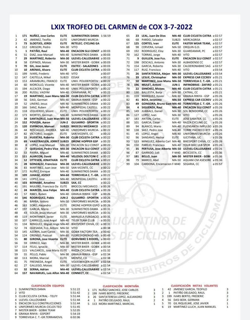 José Carlos Núñez (Suministro Dama) se ha impuesto hoy en Cox en el LXIX Trofeo Virgen del Carmen, cuarta prueba del Interclub Vega Baja 2022 tras 76 kilómetros. Moisés Espinós mantiene el maillot amarillo. Núñez ha hecho un tiempo de 1:56:59. Teófilo Jiménez (Uniformes Murcia) ha sido segundo y Jordi Slootjes (Retelec), tercero. José Carlos Núñez ha sido el primer élite; Pedro Gregori (Vito), se ha impuesto en M30; Raúl Patiño, en M40; Mikel Castella (Essax), en Sub 23; Jozsef Juhasz (Torrevieja), en M60: Loli Garrido (Bicicosta), en féminas. El Suministros Dama ha sido el mejor equipo; José Carlos Núñez ha vencido en el premio de la montaña y Teófilo Jiménez, el de las metas volantes.