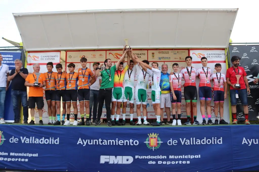 La selección de la Comunitat Valenciana ha logrado doce medallas (11 de forma material) en los Campeonatos de España de Ciclismo Escolar y Júnior que se han disputado este pasado fin de semana en Valladolid. Cuatro de ellas fueron oro, cinco platas y tres bronces. En ciclismo adaptado, en la contrarreloj cadete, el tándem formado por Nacho Rodrigo y Eric Igual se colgó el preciado metal. Los mismo hicieron Héctor Álvarez en la CRI cadete; la escuadra de BTT Infantil Femenina en Gimkhana; y el equipo júnior masculino en la prueba en línea. En esta categoría de forma material no hay medalla, pero sí fueron los campeones, aunque dicho título dejó un mal sabor de boca ya que se aspiraba al oro a nivel individual y sólo Pau Martí pudo ser quinto por no funcionar como equipo en el momento decisivo.