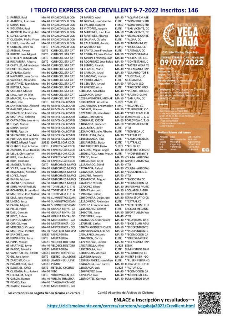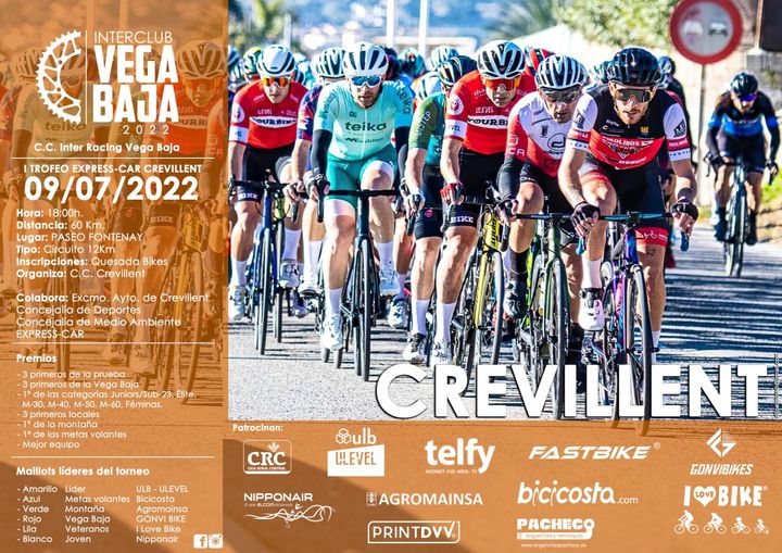 El sábado, 9 de julio de 2022, se celebrará el I Trofeo Express Car Crevillent, quinta prueba del Torneo Interclub Vega Baja 2022. La prueba, organizada por el Club Ciclista Crevillent, partirá a las 18 horas y contará con 60 kilómetros de recorrido y 1.100 metros de desnivel acumulado. Se darán cinco vueltas a un circuito de 12 kilómetros. Los inscritos son 146.