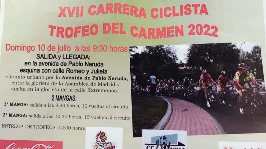El domingo 10 de julio retorna a la palestra, después de 3 años de ausencia, la Carrera Ciclista Trofeo del Carmen para las categorías elites-sub23 y máster, que cumple su 17ª edición. La prueba se desarrollará una vez más en el circuito urbano de 2.900 metros de la calle Pablo Neruda, entre las glorietas de la Asamblea de Madrid y la de la calle Extremeños. La salida y meta se ubican en la esquina de Pablo Neruda con la calle Romeo. Antonio Baile (Aranjuez) se pondrá el dorsal.