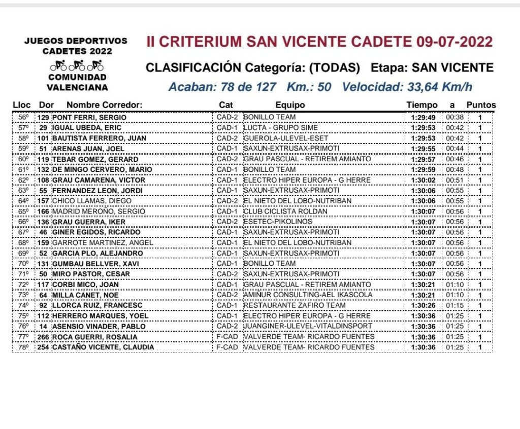 Alejandro Callado: «Desde el inicio de la carrera ha empezado la fuga la cual ha sido neutralizada a 500 metros y ha dado paso a otra que ha sido la definitiva . Carrera muy dura en fuga desde el inicio consiguiendo un segundo puesto en metas volantes, que ha ganado Carrión, y un terero en carrera».