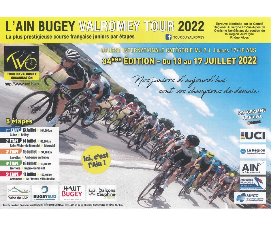La 34 edición del Ain Bugey Valromey Tour para corredores júniors comienza mañana en Culoz, miércoles 13 de julio, y se finalizará el domingo, 17 de julio de 2022 en Hauteville-Lompnès. Participan 28 equipos de 6 corredores y 13 nacionalidades diferentes. Entre todos ellos figura el Drone Hopper Gsport con el alicantino Raúl Mira formando un sexteto en el que aparecen también Pau Martí, Ricky Buba, Taylor Churchill, Miguel Cozar y Román Torrella.