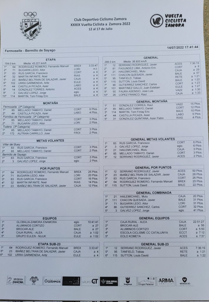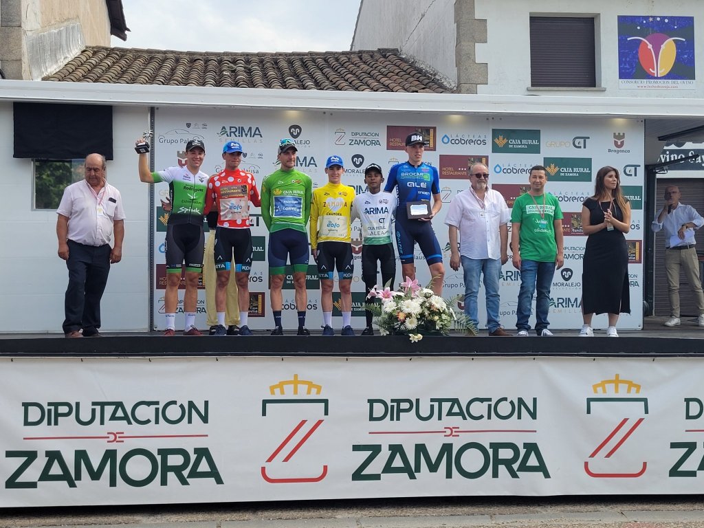 En el acto de pódium acompañaron a los ciclistas Raúl Rodríguez, alcalde de Bermillo de Sayago, José María Nieto, Diputado de zona, Gloria Lorenzo, directora comercial del Grupo CT, José Manuel Payo, representante de Caja Rural Zamora, además de Manuel Campesino, director de la prueba. A ese pódium subió el ganador Fernando Rodríguez, Javier Serrano para recoger el maillot amarillo de Zamora Enamora-Diputación de Zamora, el azul de la regularidad de Lácteas Cobreros y el rojinegro de Moralejo Selección como sub-23. Hacían lo mismo Mulu Kinfe Hailemichael como líder de la combinada de Grupo CT; Fran Muñoz (EoloKometa) por líder de la clasificación de la montaña del Hotel Restaurante Casa Aurelia; Fran Rus, el mejor en las metas volantes; y Tom Martin (Brocar), tras ser designado el ciclista más combativo de hoy.