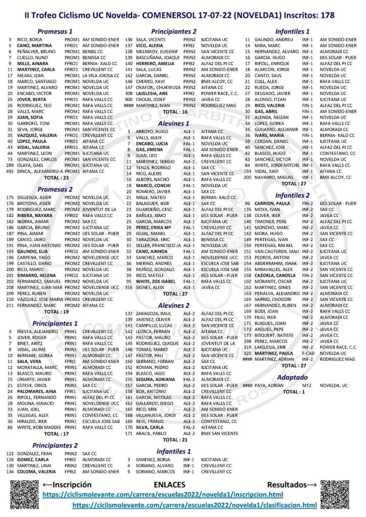 - Benissa. XLIII Prova Provincial d’Escoles de Ciclisme Vila de Benissa – Memorial Alejandro Jaén. Clasificaciones