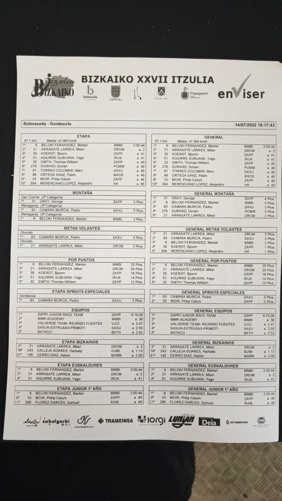 Markel Beloki (MMR Academy) se ha impuesto en la primera etapa de la Bizkaiko XVII Itzulia júnior que ha comenzado en Balmaseda y finalizado en Gordexola, con 87,01 km de recorrido. Se ha impuesto al esprint a Mikel Arrasate (Café Dromedario). Bjoem Koerdt (Zappi) ha dado tiempo al pelotón. En el Top 10 destacar la presencia de Marc Torres (Saxun), que ha sido séptimo, y de Alejandro Merenciano (Infinobras), décimo. Protagonismo en la primera parte de la prueba para Pedro Cámara (Saxun), que estuvo metido en una escapada, lo que le ha servido para vestirse con el maillot de los Sprints Especiales. Aarón Poveda que corre con el Talleres Dilla, también ha estado escapado.