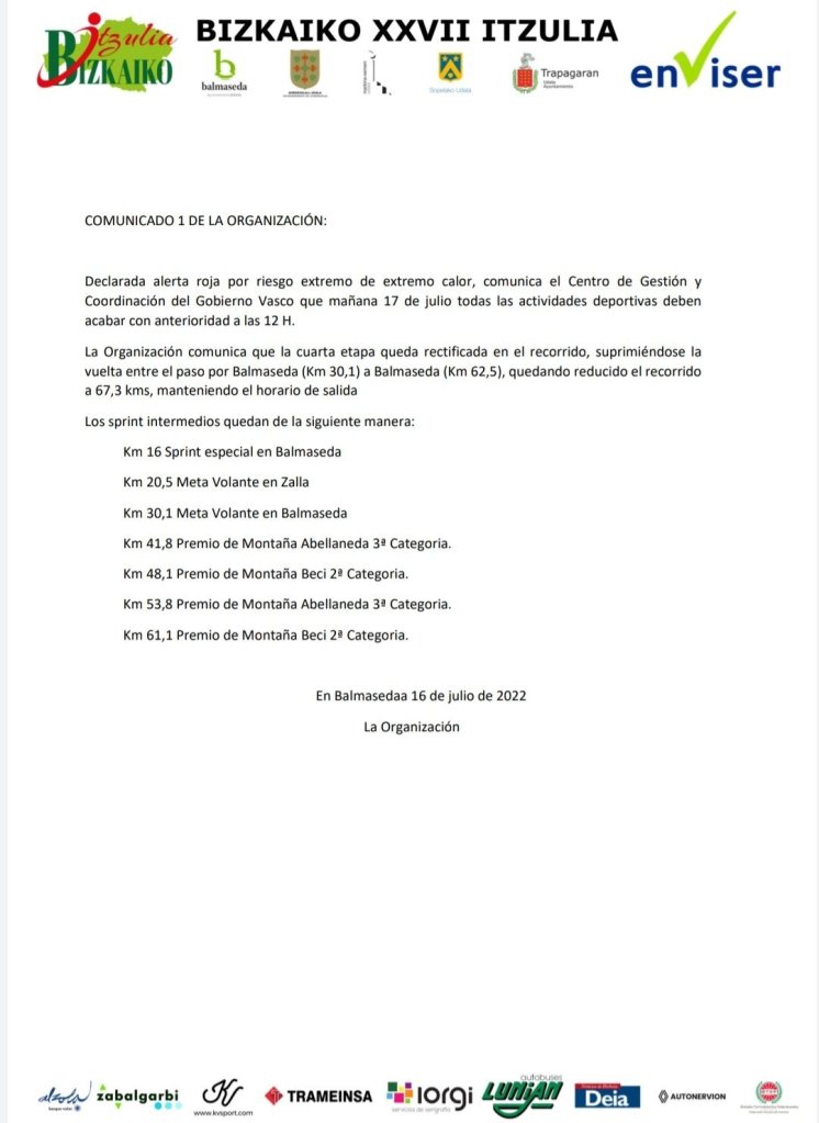 La organización, debido al calor, ha reducido el kilometraje de la última etapa y lo deja en 67,3. Este es su comunicado: