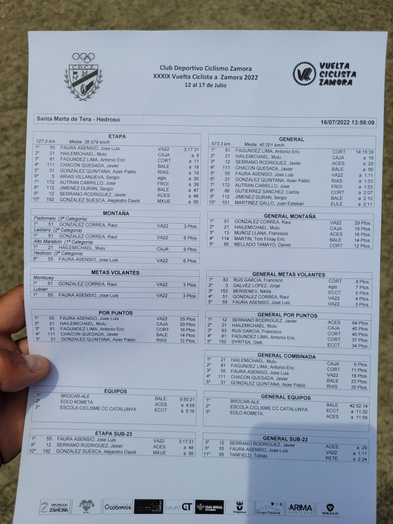 Ante la vigilancia que había entre Mulu y Fagúndez en la pelea por el amarillo, era Faura el que aprovechaba su momento, moviendo ficha a 4 kilómetros de la llegada. El ciclista murciano de 21 años abría un pequeño hueco que sería definitivo, y aunque sufría de lo lindo en el muro de hormigón en Hedroso conseguía dar una merecida victoria al conjunto del Valverde Team tras una ronda en la que han sido protagonistas todos los días. Mulu y Fagúndez entraban tras él, siendo el liderato para el uruguayo del Cortizo, aunque las diferencias siguen siendo mínimas entre ellos de cara al epílogo de la vuelta de mañana en Toro. Javi Serrano tiraba de casta en ese tramo definitivo y se dejaba solo 48”, aunque no era suficiente para mantener esa condición de adalid.