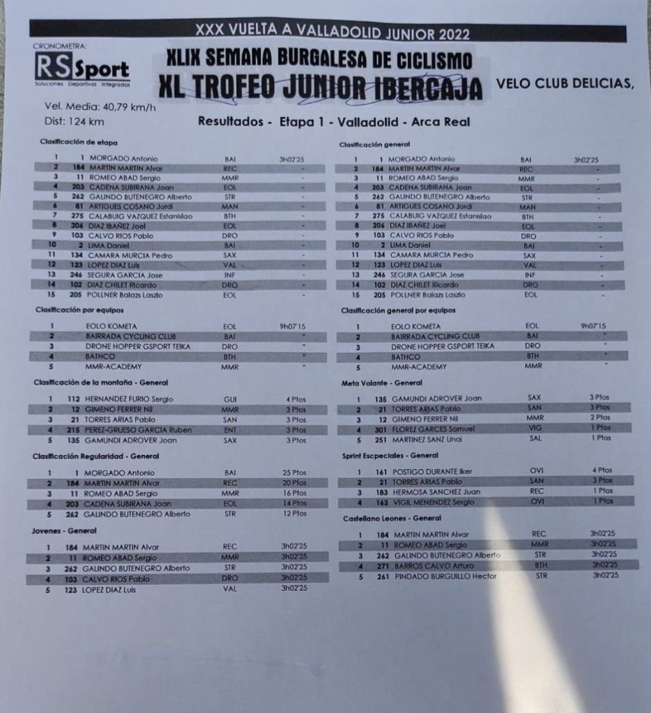 Antonio Morgado (Baiarrada) se ha impuesto al esprint en la primera etapa de la Vuelta Ciclista a Valladolid Júnior con salida y meta en Valladolid y 124 kilómetros de recorrido. Alvar Martín (REC) ha sido segundo y Sergio Romero (MMR) ha completado el podio. Pedro Cámara (Saxun) ha sido undécimo y José Segura (Infinobras) finaliza en la plaza 13. Sergio Hernánez (Guijarro) se ha vestido con el maillot de la montaña y Joan Gamundi (Saxun), con el de las metas volantes.