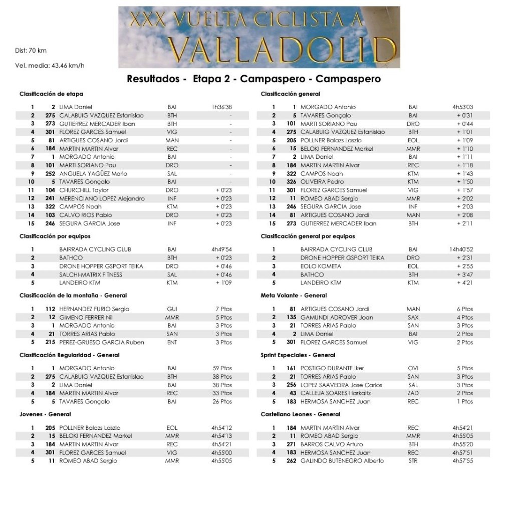Daniel Lima (Bairrada) ha ganado el segundo sector de la Vuelta Ciclista a Valladolid que ha tenido salida y meta en Campaspero y 70 kilómetros de recorrido. Antonio Morgado (Bairrada) sigue de líder. Dentro del Top 15 de la jornada los corredores del Infinobras Alejandro Merenciano y José Segura. Sergio Hernández (Guijarro) sigue con el maillot de la montaña.